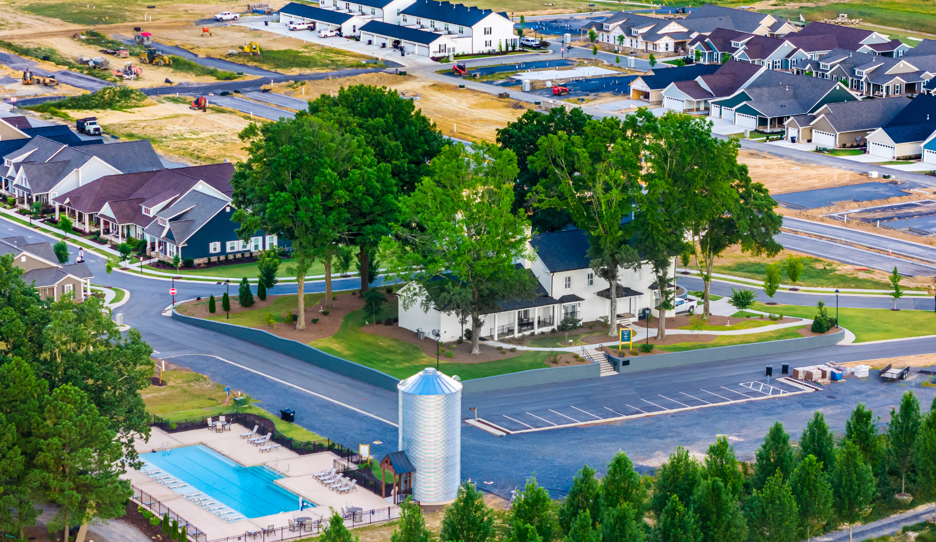 In addition to the construction of quads, townhomes, and cottages, additions in Phase 2 included the resort-style swimming pool and distinctive metal silo, the flag pole and roundabout, additional landscaping and green spaces, raised-bed community gardens, and the dog park. Phase 2 is nearing completion.